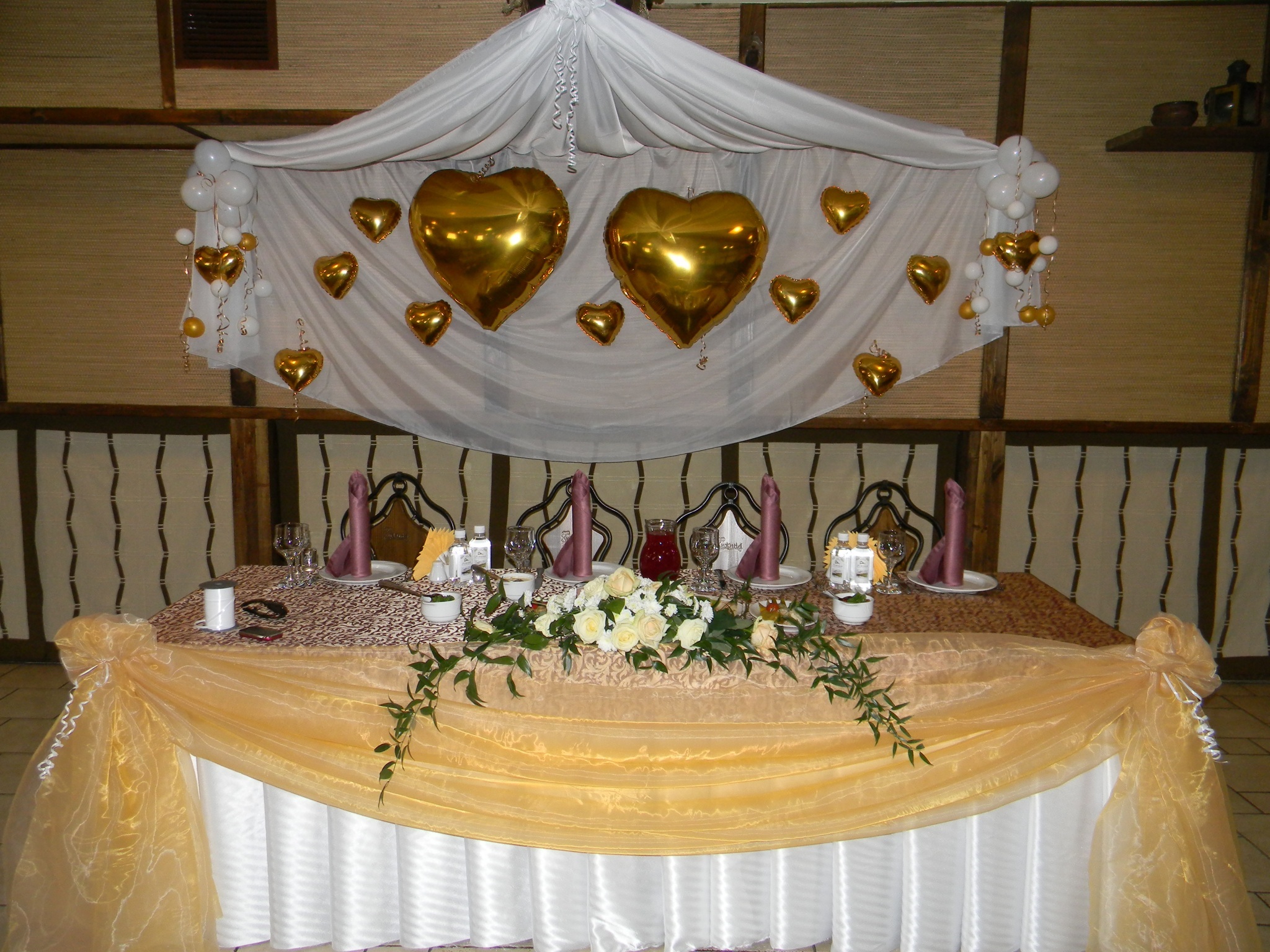 Оформление президиума молодых, декор тканью, фольгированные сердечки, украшение стола молодых, юбка, цветочная композиция.
